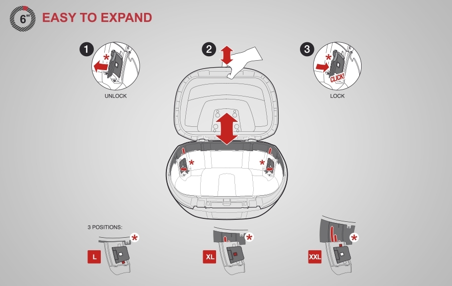 Design, tecnologia e experiência juntos para desenvolver o único baú central do mercado expansível até 58 litros. Seu volume é ajustável em três posições diferentes em poucos segundos - 46 litros, 52 litros e 58 litros. A funcionalidade e praticidade desse baú adapta-se a qualquer momento às necessidades de bagagem do motociclista, das rotinas diárias na cidade até as viagens de aventura.